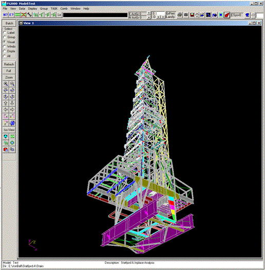 FS2000 has been developed with the objectives of producing an analysis system that is interactive and graphically orientated. Model generation and load definition can be driven from text based commands since all definition data is in the form of text files but the interactive/graphical approach is far more effective in all respects. Virtually all definition data can be shown graphically, this includes dimensioning, properties, effective length data, loads etc. By using Saved Views all definition data can be reproduced graphically on paper in the same manner in which it was defined. Using Saved Views and conventional tabular output the process of model definition and model QA be can extremely thorough and efficient.